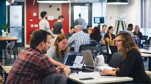 Employees collaborating on a presentation in a bustling open office environment