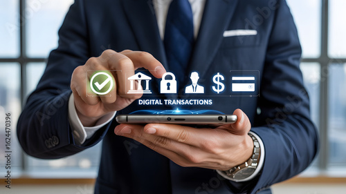 Empowered businessman interacts with digital transaction icons, securing finances with modern technology.