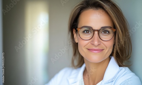 Empowered Female Scientist in Lab Coat with Glasses, Head Tilted Slightly Upwards