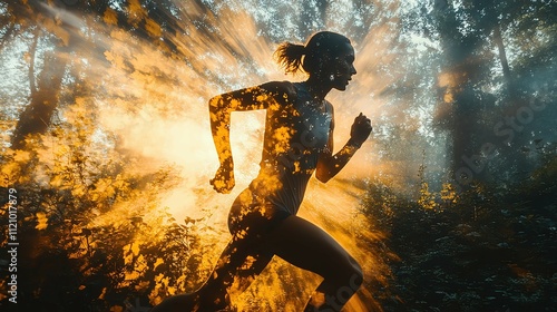 Empowered runner in nature with double exposure effect , artistic fitness scene featuring empowered runner blending with sunlight , strong visual of empowered runner expressing motion