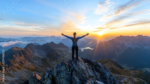 Empowering fit woman celebrates sunrise atop mountain nature motivational scenic inspirational