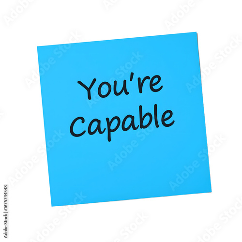 Empowering message on vibrant blue sticky note Bold handwriting proclaims Youre Capable Motivational concept on isolated white backdrop, isolated
