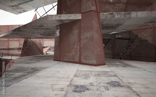 Empty abstract room interior of sheets rusted metal and brown concrete. Architectural background. 3D illustration and rendering