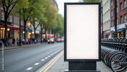 Empty advertisement billboard on city street with bicycles nearby