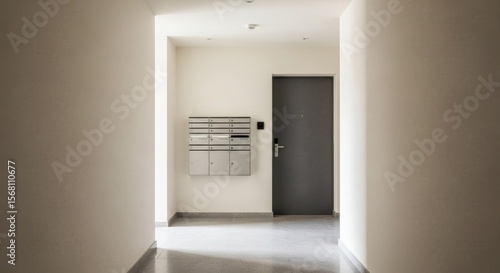 Empty apartment hallway interior with mailboxes and door. Modern residential building corridor for property and real estate concept.