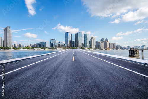 Empty asphalt road and city buildings skyline