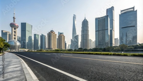 Empty asphalt road passing through the heart of a modern city amidst towering skyscrapers and office buildings, concrete highway, empty road, skyscraper, steel and glass, urban sprawl