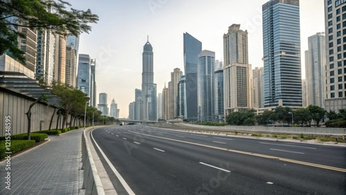 Empty asphalt road passing through the heart of a modern city amidst towering skyscrapers and office buildings, skyscraper, high-rise buildings