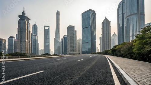 Empty asphalt road passing through the heart of a modern city amidst towering skyscrapers and office buildings, urban sprawl, skyscraper, modern cityscape, empty road, high-rise buildings