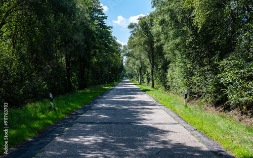 Empty asphalt road through the woods around Füchtenfeld, Lower Saxony, Germany