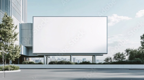 Empty billboard in a modern urban setting, surrounded by greenery and a city skyline.