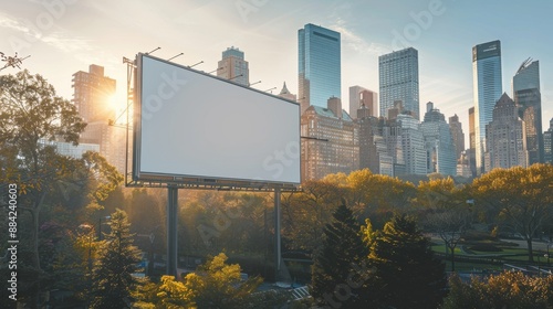 Empty Billboard in Urban Park with City Skyline in Background
