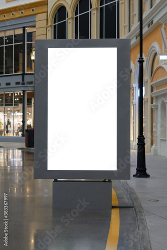 Empty billboard inside the mall, next to the shop windows. Mockup.