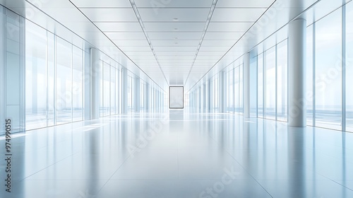 Empty billboard placed in the center of a spacious, minimalist floor, with a bright background ready for mock-up designs