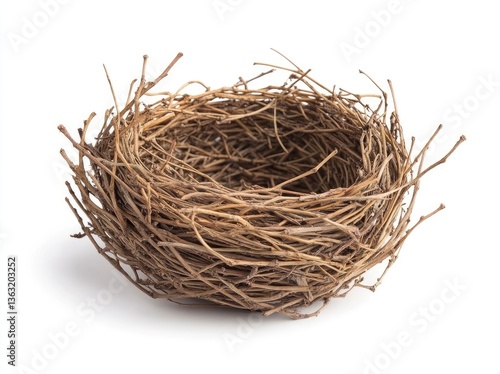 Empty Bird Nest Made of Twigs Isolated on White Background