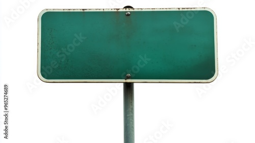 Empty blank green road sign on a sturdy metal pole isolated on white background