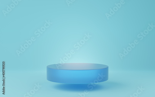 Empty blue cylinder podium floating on blue background. Abstract minimal studio 3d geometric shape object. Mockup space for display of product design. 3d rendering.