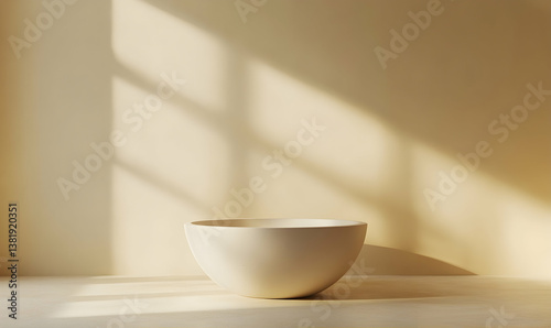 Empty bowl, sunlight, beige wall, minimal background, product display