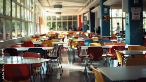 Empty Cafeteria Tables and Chairs.