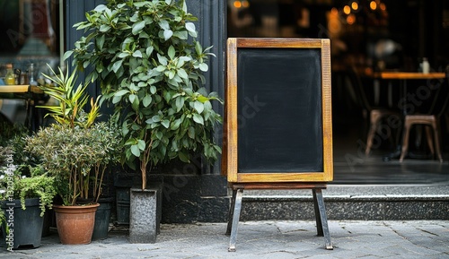 Empty chalkboard menu board outside a cafe. Lush greenery adds charm