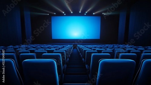 Empty cinema hall with blue lighting and large screen, ideal for movie screenings or events