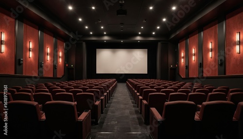 Empty cinema interior featuring rows of plush red seats facing large blank screen. Modern theater with dim ambient lighting, decorative wall sconces, perfect for film premieres, corporate