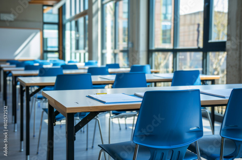 Empty, classroom and desk for student campus or back to school learning or university study, education or scholarship. Furniture, academy and academic support for youth future, teaching or knowledge
