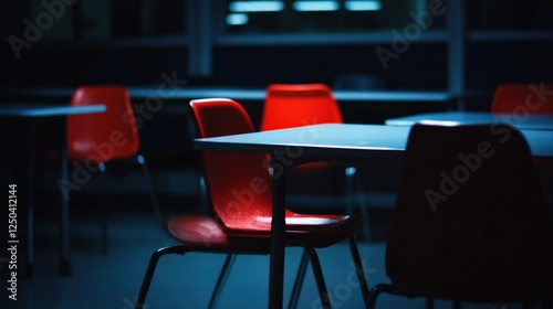 Empty Classroom At Night With Red Chairs And Blue Lighting Creating A Moody Atmosphere