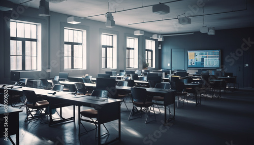 Empty classroom with modern chairs and desks generated by AI