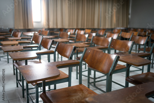Empty classroom with vintage tone wooden chairs. Back to school concept