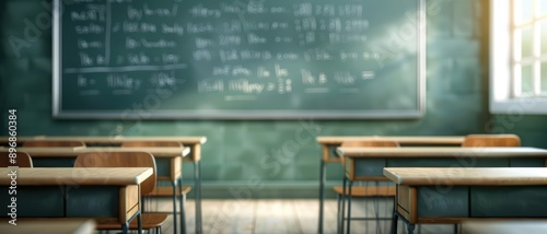 Empty Classroom with Wooden Desks and Chalkboard in Sunlit School Setting