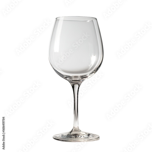 Empty clear glass wine goblet, wide bowl, slender stem, and a thick base
