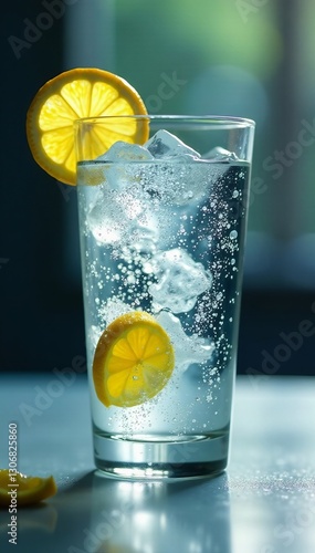 Empty clear glass with condensation, lemon wedge on rim, summer, alcohol, mocktail