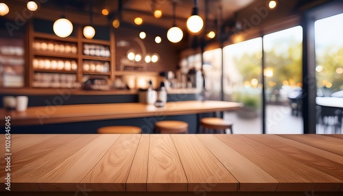 empty coffee table over defocused coffee shop background with copy space