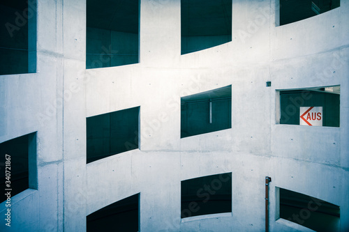 Empty concrete spiral-shaped building, Natural light from ceiling, red exit sign, window perspective