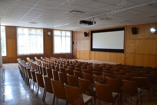 Empty Conference Hall With Rows of Chairs and a Large Screen in a Well-Lit Space During a Daytime Setting