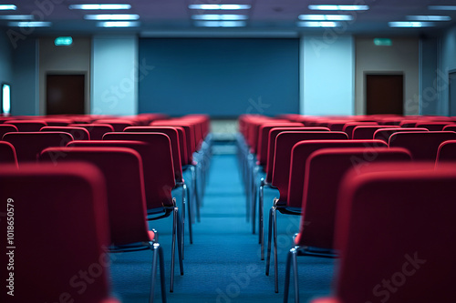 Empty Conference Hall with Rows of red Chairs, Capturing the Calm Before a Busy Meeting or Presentation