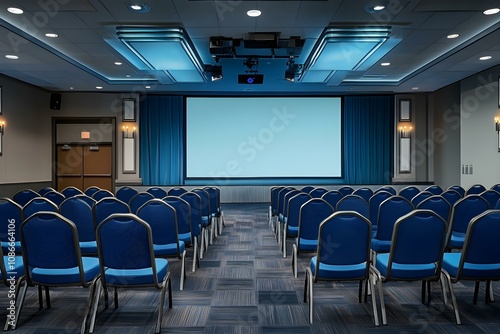 Empty Conference Room Auditorium with Blue Chairs