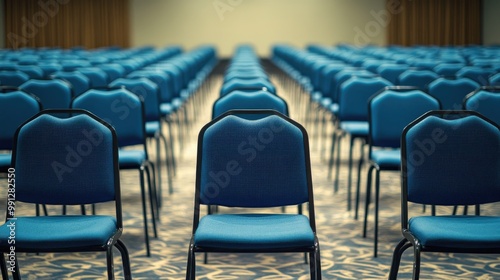 Empty conference room featuring blue chairs lined up in perfect rows, ready for an upcoming corporate event