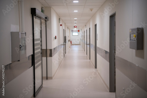 Empty corridor at public hospital, Public building corridor area. Hospital hallway with rooms. Medical concept. Institute of Cardiovascular Disease.