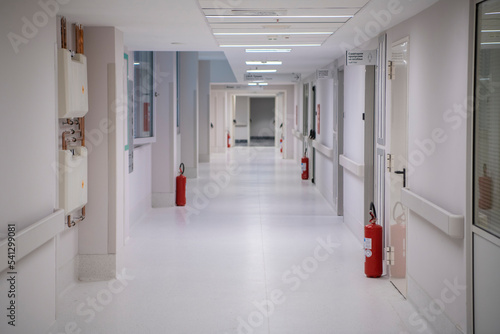 Empty corridor at public hospital, Public building corridor area. Hospital hallway with rooms. Medical concept. Institute of Neurosurgery. Belgrade, Serbia 11.10.2022