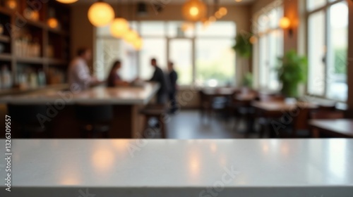 Empty counter in a blurred restaurant scene with warm lighting and people socializing