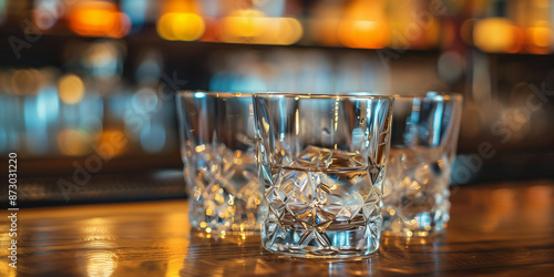 Empty crystal glasses on a bar counter with a blurred background of a cozy, warmly-lit restaurant.