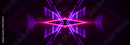 Empty dark abstract background. Background of empty show scene. Glow of neon lights and neon figures on an empty concert stage. Reflection of light on the pavement.