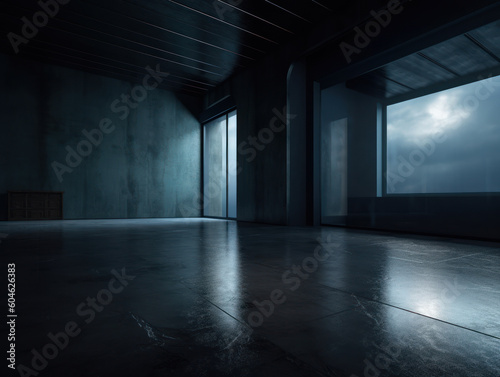 Empty dark room with concrete floor and black wall Created with Generative AI technology