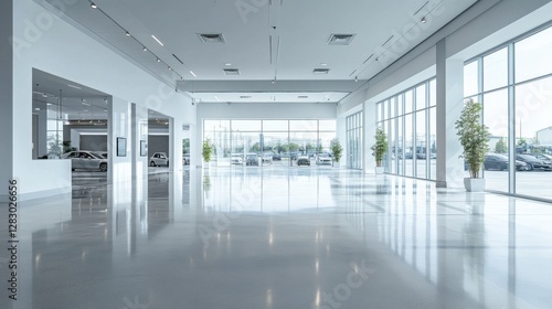 Empty dealership with sleek showroom and polished floors. Featuring flexibility and opportunity