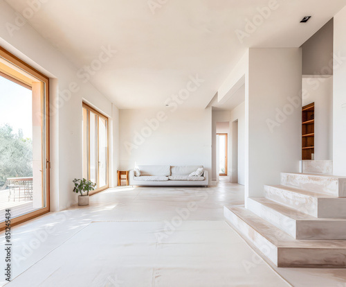 Empty designer modern living room filled with natural window lighting in a mix of warm and neutral colors. Real Estate interior design composition.