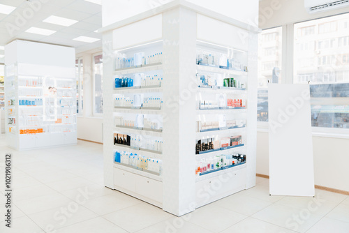 Empty drugstore chemist`s shop pharmacy without staff clients customers visitors with remedies, pills, medicines, goods, painkillers, jars on shelves