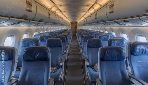 Empty Economy Class Cabin of a Passenger Airplane, Featuring Rows of Comfortable Seats and an Aisle.