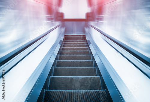 Empty escalator or moving stair. Also called stairway or staircase. Modern architecture design with step, glass for lift people up floor building i.e. shopping mall, airport, metro and subway station.